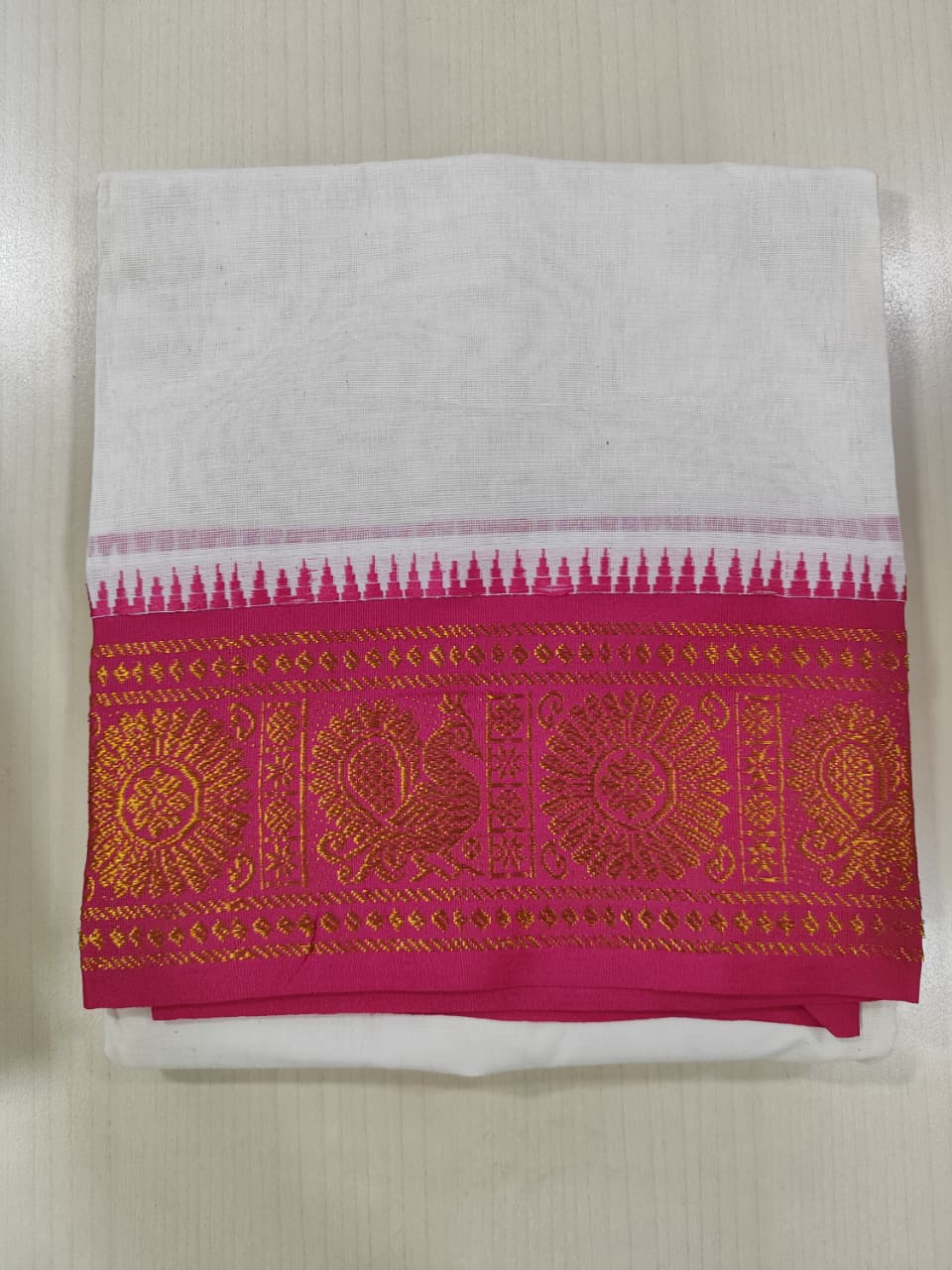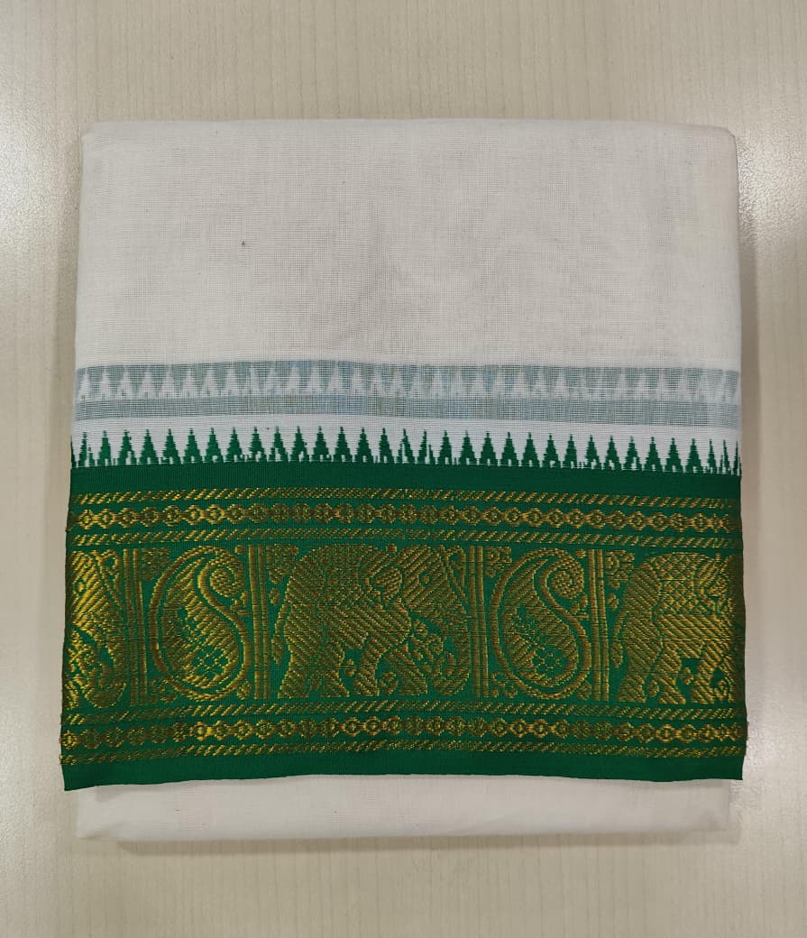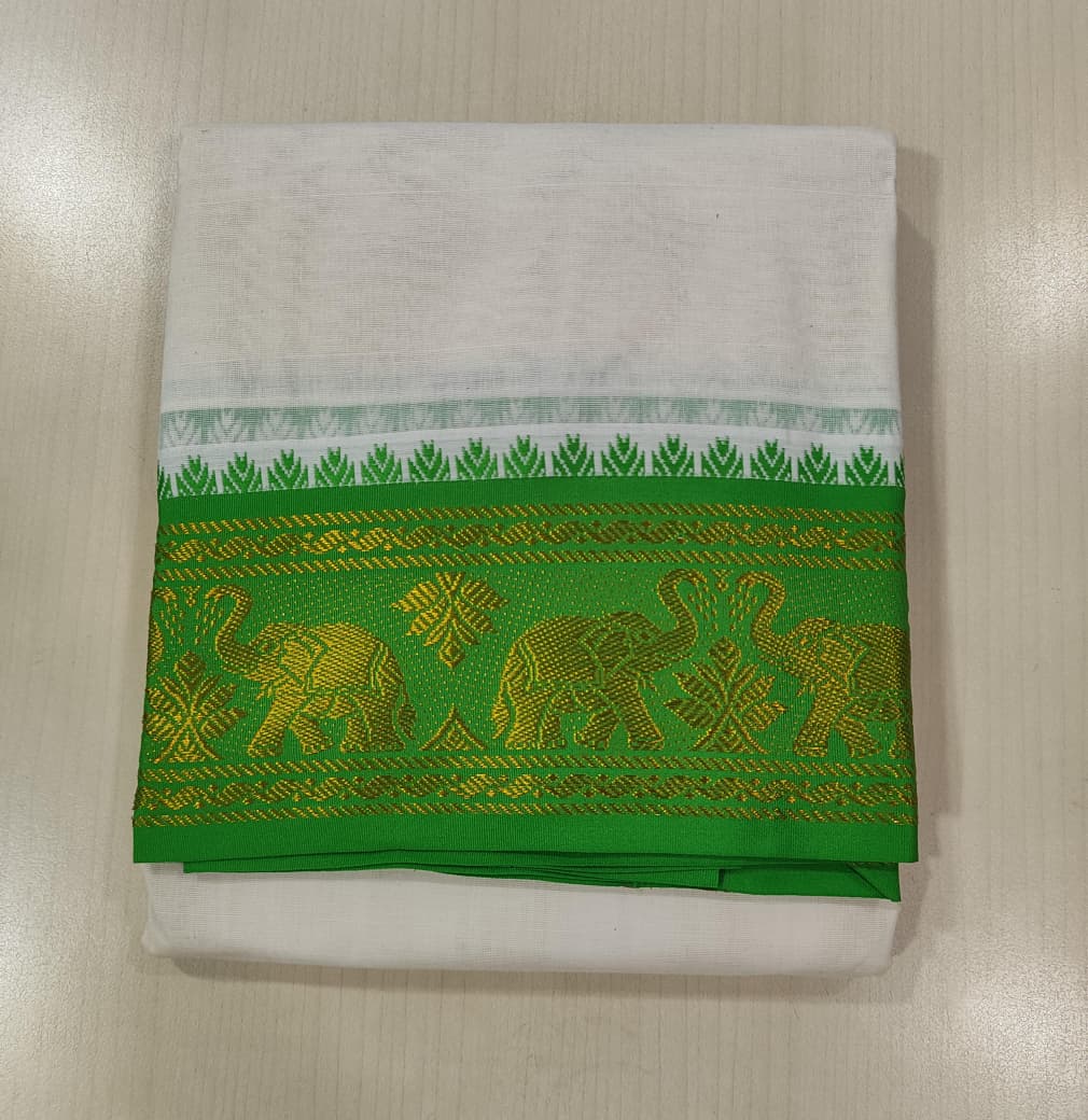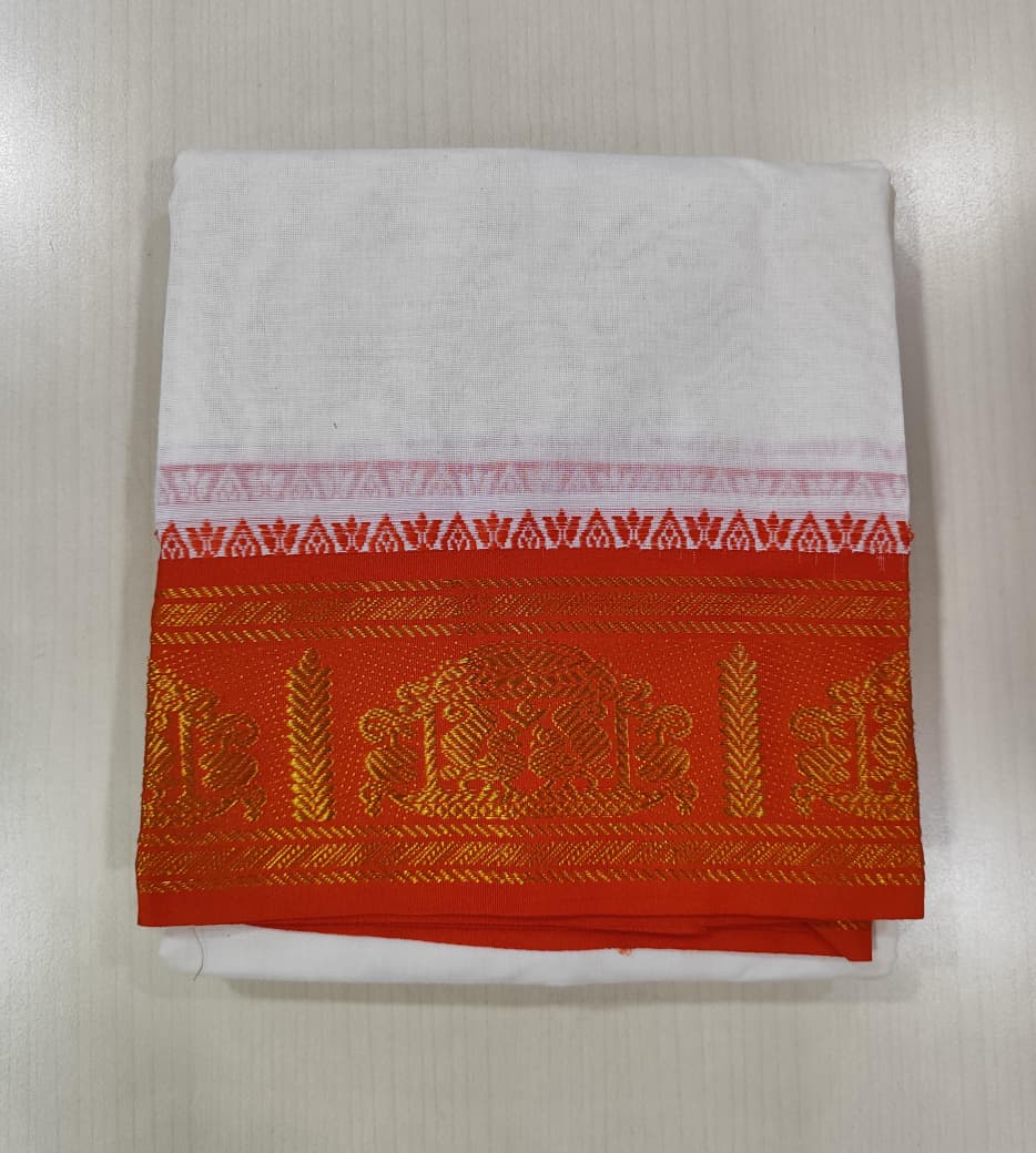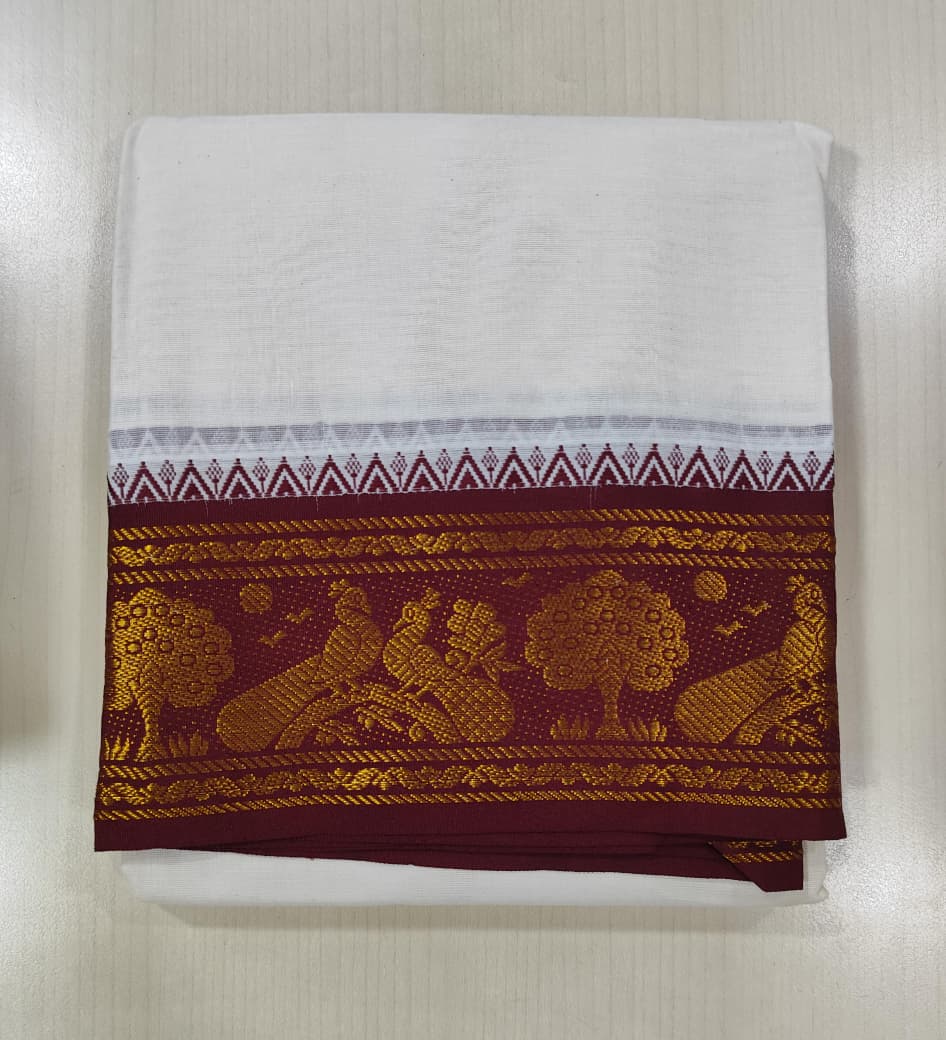 | Dhoti Size | 4.10m + 2.25m (9 muzham + 5 muzham) – Dhoti With Angavastram (9×5), 4.55 + 2.75m (10 muzham + 6 muzham) – Dhoti With Angavastram (10X6) |