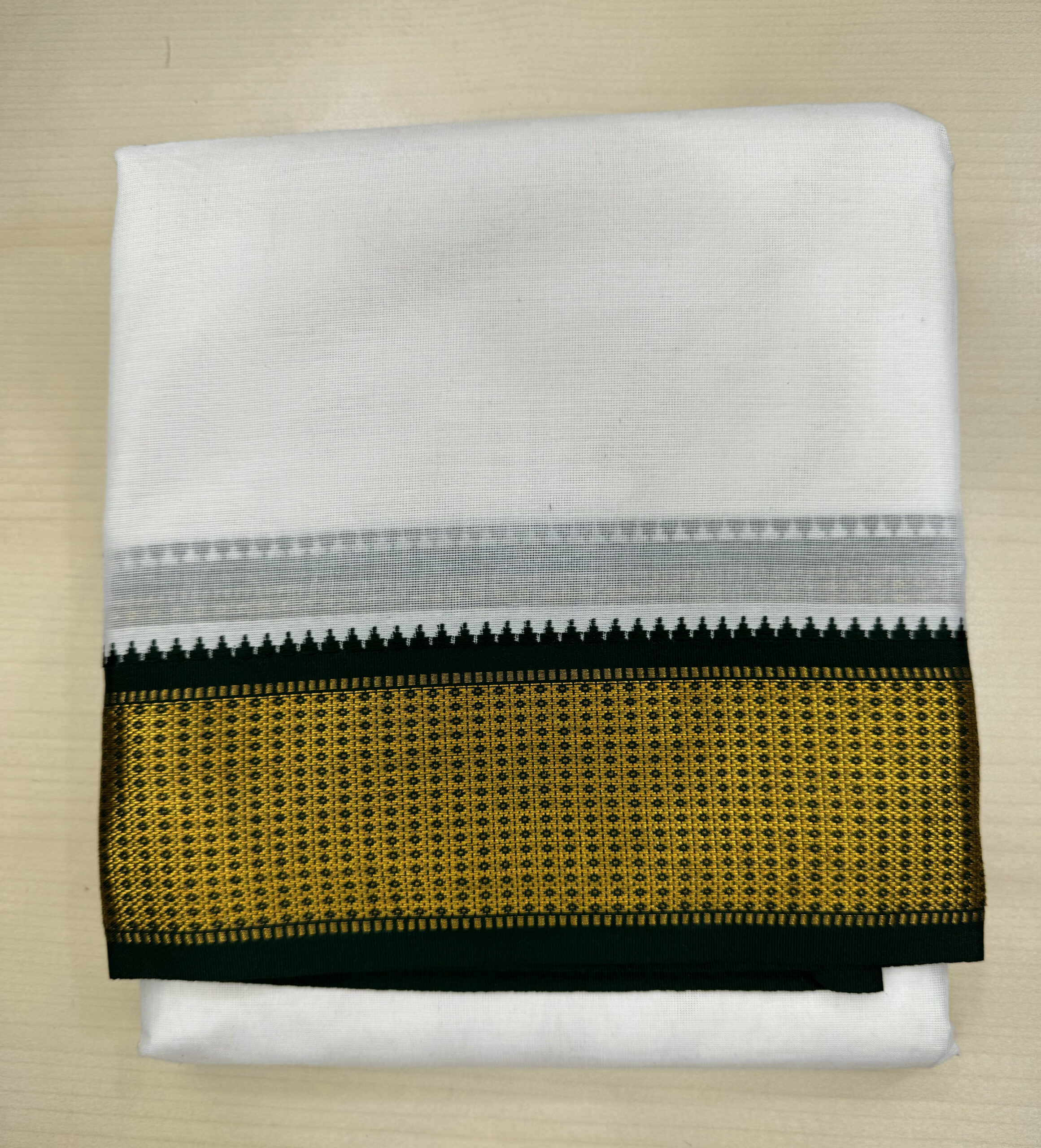Dhoti Size | 4.10m + 2.25m (9 muzham + 5 muzham) – Dhoti With Angavastram (9×5), 4.55 + 2.75m (10 muzham + 6 muzham) – Dhoti With Angavastram (10X6) |
